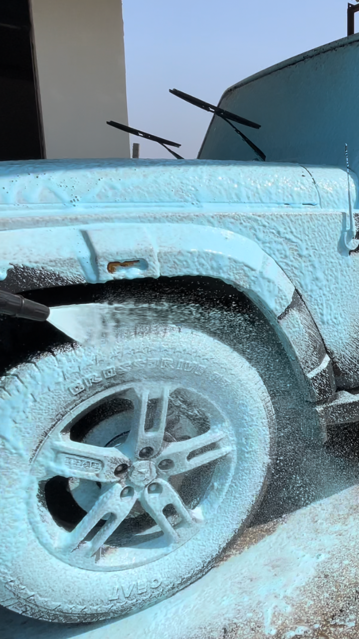 We applied a thick layer of vibrant blue foam across the entire car exterior. The striking blue foam not only looked amazing but also worked effectively in loosening tough dirt, grime, and road contaminants.